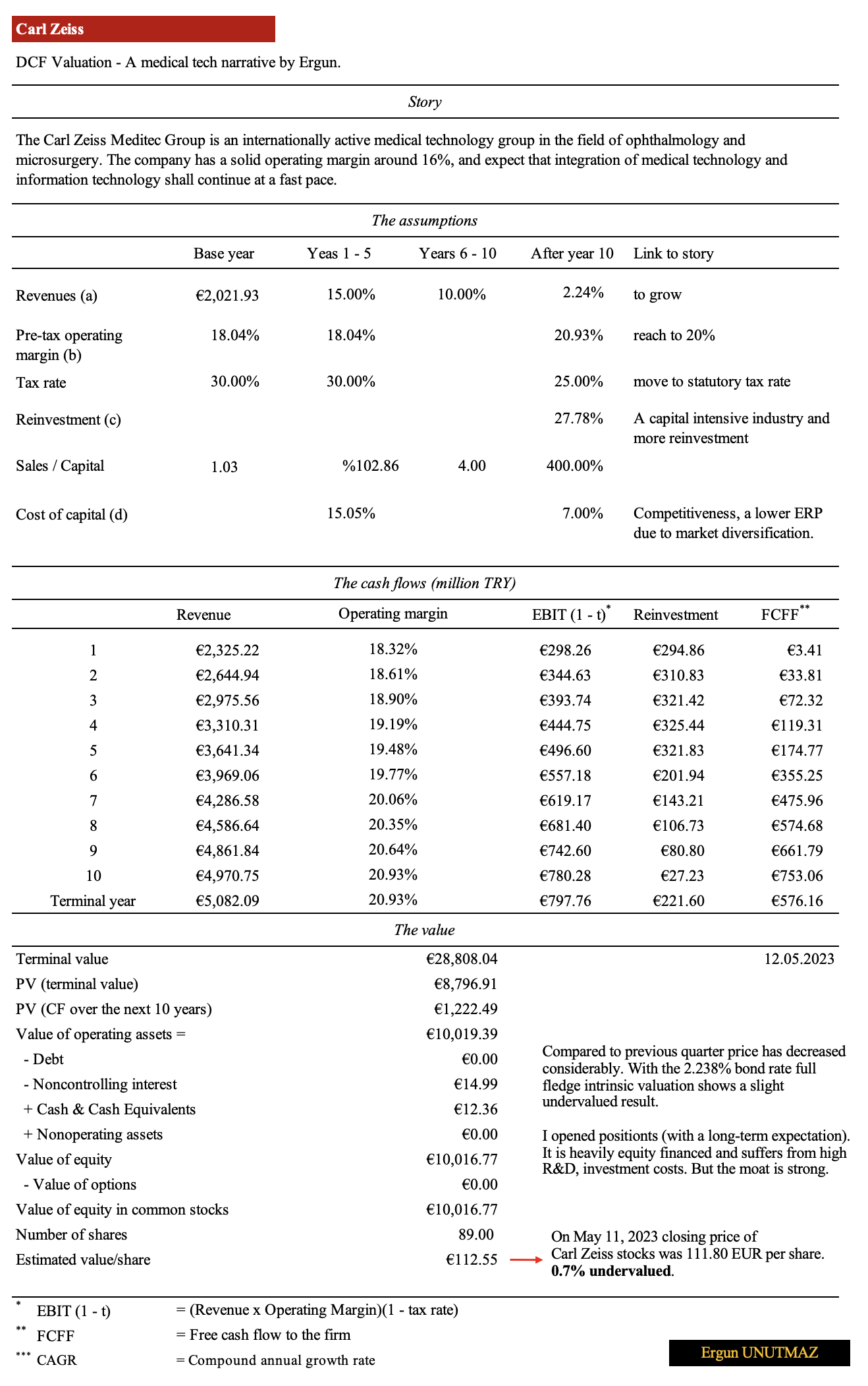 On May 11, 2023 closing price for the AFX stocks was 111.80 EUR per share. The intrinsic value that I have calculated was 112.55 EUR per share. According to my assumptions and expectations Carl Zeiss stocks was 0,7% undervalued.