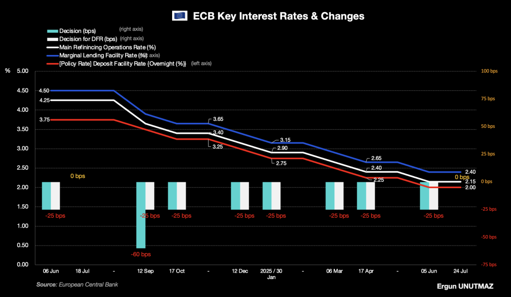 ECB ilk indirimi 25 bp ile 2024 yılının Haziran ayında yapmıştı ve Avrupa Merkez Bankası Başkanı Christine Lagarde’ın başkanlığında politika faizi, 18 Temmuz 2024 tarihli toplantı dışında her oturumda 25 bp indirilmişti. 24 Temmuz 2025 tarihli toplantıdaysa bu kez frene basıldı ve politika faizi sabit tutuldu.