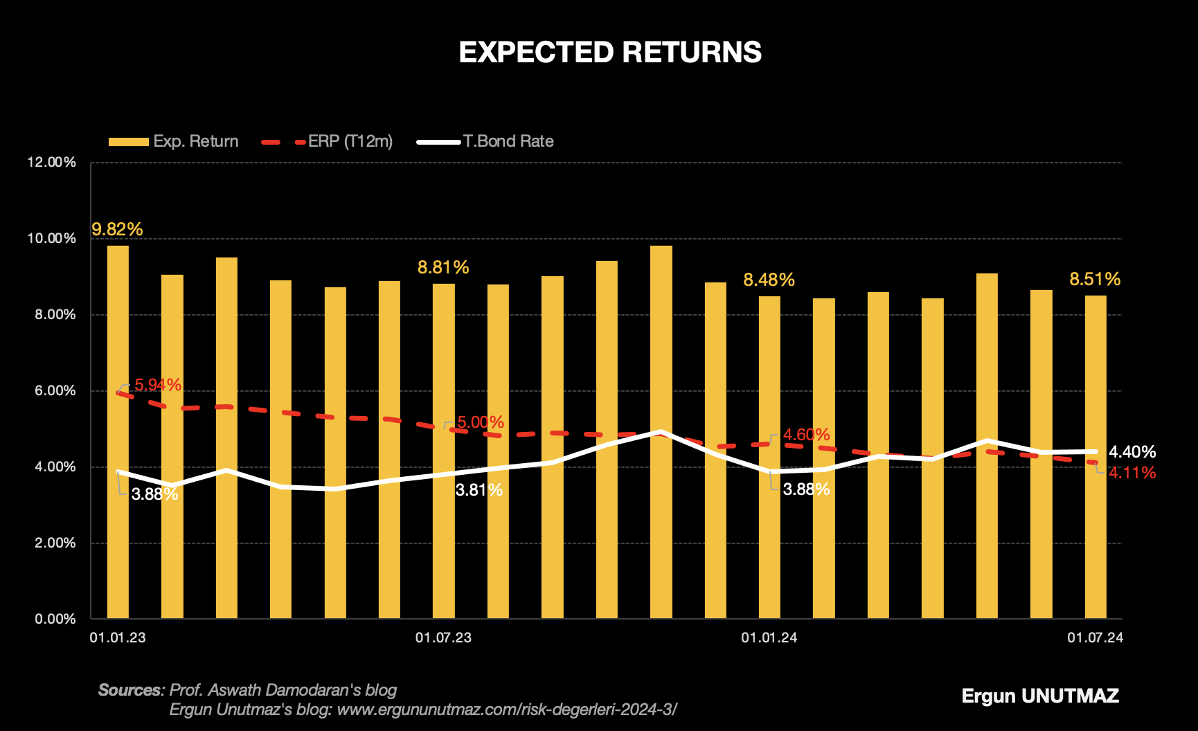 Damodaran Hoca’nın S&P 500 Endeksinin aylık kapanış verilerini baz alarak her ay paylaştığı hisse senedi risk primi çıktısı yanında bir de altı ayda bir güncellediği çalışması vardır. Aradaki geçişi takip edebilme kolaylığı açısından hisse senedi risk primi (kırmızı), on yıllık devlet tahvili getirisi (beyaz) ve bunların toplamından oluşan beklenen getiri değerlerini (sarı) 2023 yılının başından 2024 yılı Temmuz ayına kadar Grafik 2’de gösterdim.