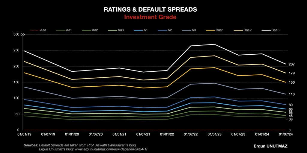 Değerleme çalışması yürütürken şirketlere özgü finansal dengeyi gözeterek şirketin temerrüt riskini de hesaplamalara dâhil etmek ayrı bir inceliktir. Bu nedenle de yine Profesör Aswath Damodaran’ın sitesinden elde ettiğim verilerle şirketlerin faiz karşılama oranlarına denk düşen kredi notlarını ve bu notların ifade ettiği zımni temerrüt riski primlerini düzenli olarak aşağıya ekledim.