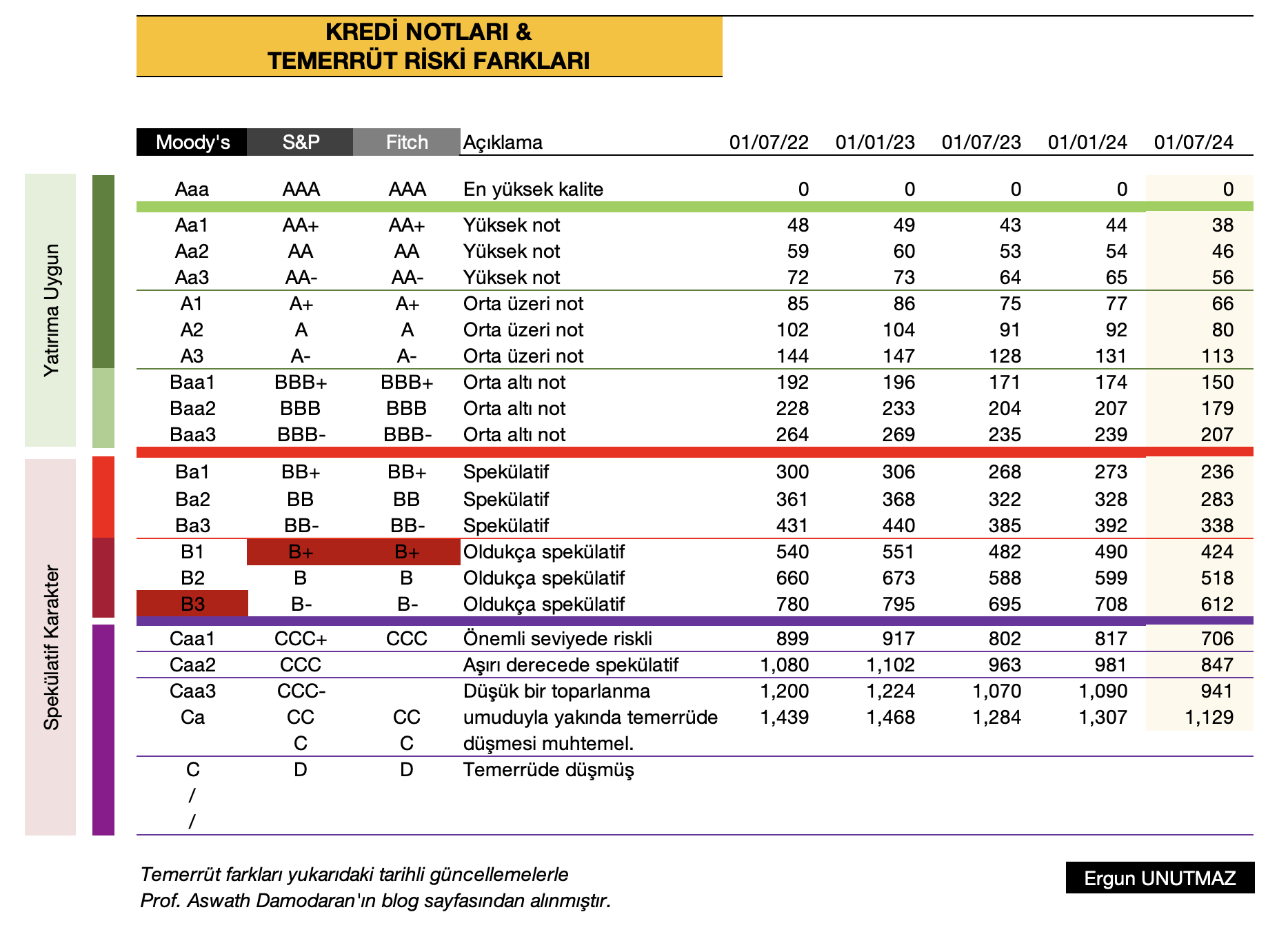 Tablonun dikey olarak ikinci yarısıysa Temerrüt Farkı (Ds) için bu notların karşılık geldiği risk düzeylerini belirtmektedir. En sağdaki sütun son yayımlanan verileri içermekte olup 01 Temmuz 2024 verilerini esas almaktadır. Tabloda kırmızı renkle işaretlediğim Türkiye’nin kredi notu, 22 basamaktan Moody’s dikkate alındığında 16., diğer kuruluşlara göreyse 14. basamakta yer almaktadır. Yatırım yapılabilir seviyenin 3 basamak altında bulunan ve spekülatif karakter bölümündeki yer, söz konusu notun karşılığı olarak da oldukça spekülatif anlamına gelmektedir.