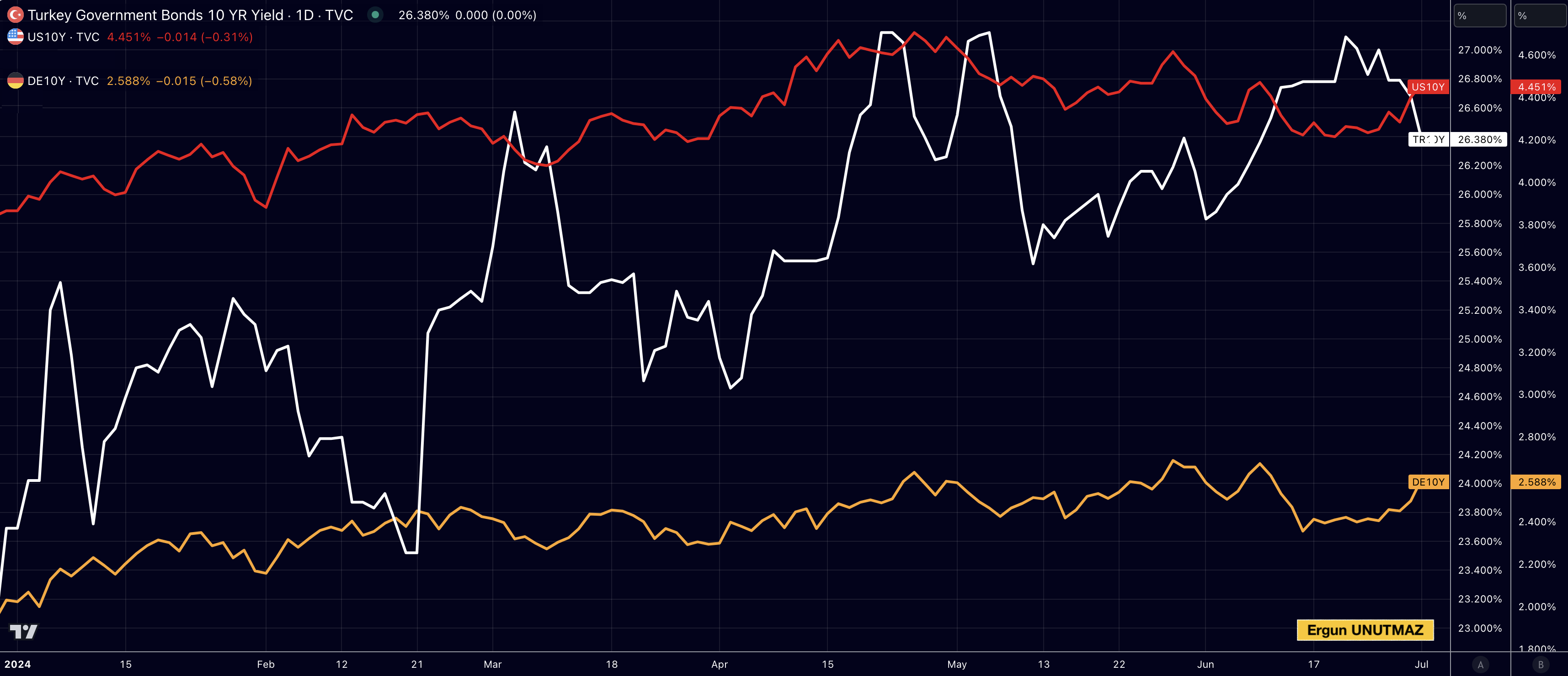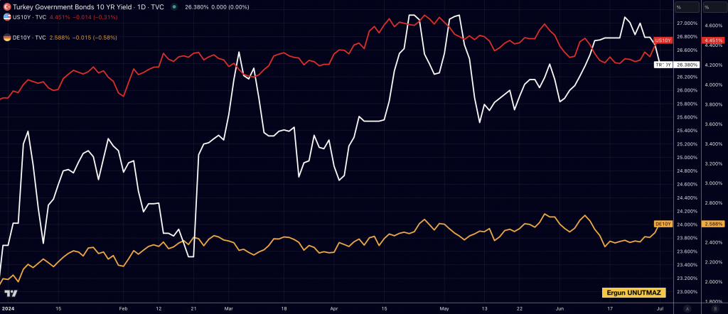 Grafik 1’de Türkiye (beyaz – ilk eksen), Amerika Birleşik Devletleri (ABD, kırmızı – ikinci eksen) ve Almanya (sarı – ikinci eksen) için 10 yıllık devlet tahvillerinin getiri oranlarının 2024 yılındaki seyrine yer verdim. 01 Temmuz 2024, Pazartesi günkü kapanışa göre getiri oranları (kendi para birimleri üzerinden) yüzde 26,380 – yüzde 4,465 ve yüzde 2,603 şeklindedir.