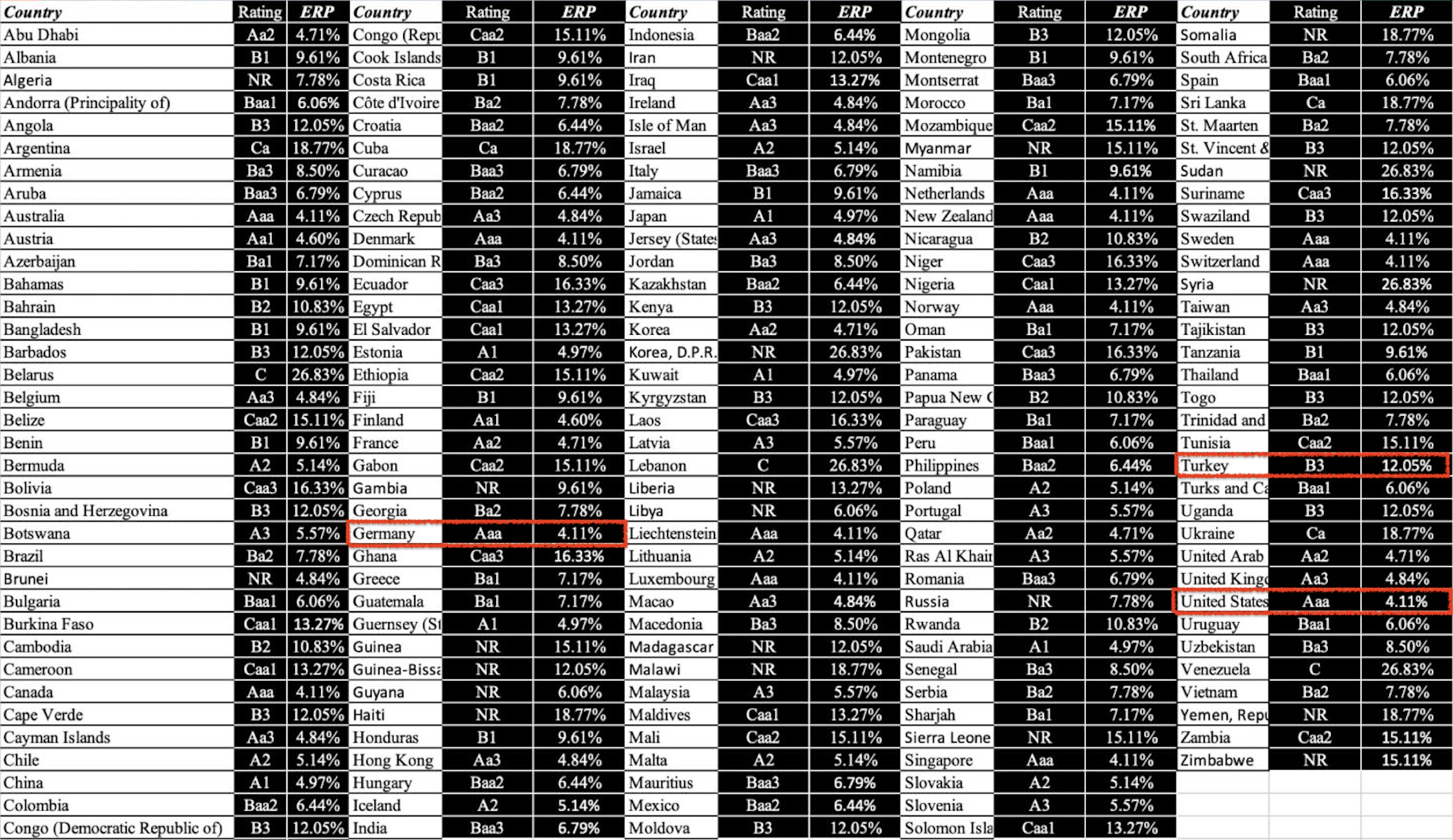 Ülkelerin borçlarını ödeyebilme kapasitesi ve riskleri açısından Moody’s, Standard and Poor’s (S&P) ve Fitch gibi kredi derecelendirme kuruluşları bu alanda hizmetler sunmaktadır. Küresel ölçekte faaliyet gösteren ve eleştirildiği yönleri olsa da tanınırlık ve saygınlık düzeyine sahip bu kuruluşlar temerrüt riskleri kapsamında ülkeler için değerlendirmeler yapmaktadır. Damodaran Hoca da bu verilerden yola çıkarak ülke ve hisse senedi risk primlerini hesaplamaktadır.