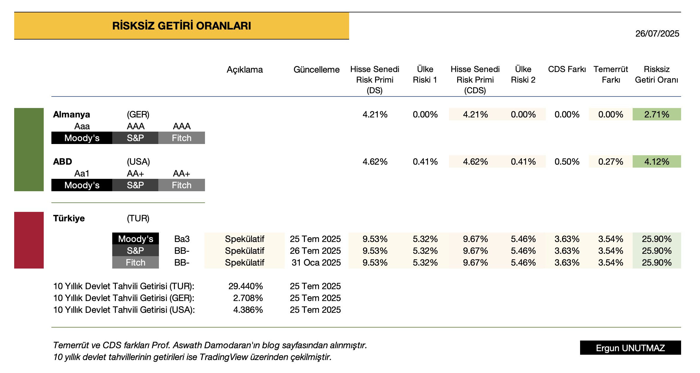 Tablo 3’te, Türkiye, Almanya ve ABD için temerrüt riski farkları ile risksiz getiri oranları yer almaktadır. Almanya Aaa şeklinde en üst düzey kredi notuna sahip ülke konumunu devam ettirirken ABD için kredi notu Aa1 şeklindedir. Almanya için 10 yıllık tahvillerin getirileri doğrudan risksiz getiri oranı olarak alınabilmektedir. 25 Temmuz 2025 tarihli kapanışta bu oran yüzde 2,708 şeklidedir. Dolayısıyla bu oran Avrupa’daki şirketlerle yürütülecek İndirgenmiş Nakit Akışları Değerlemesinde risksiz getiri oranı olarak kullanılabilir. ABD içinse kredi notu ve temerrüt farkı dikkate alınmalıdır. 10 yıllık devlet tahvili getirisi yüzde 4,386 seviyesindedir. Türkiye içinse oran son kapanışta yüzde 29,44 olarak geçmektedir. Mevcut tahvil getirisinin gerçekleri yansıtmayabileceğini düşünenler daha önce paylaşmış olduğum simülasyon yöntemini kullanabilirler.