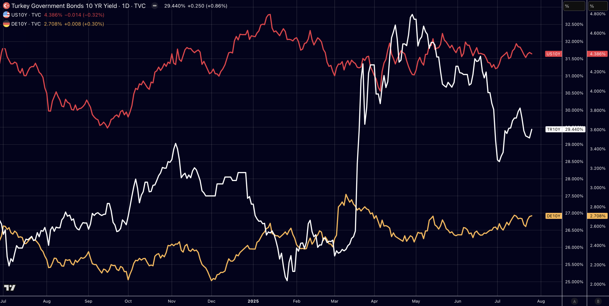 Grafik 1’de Türkiye (beyaz – ilk eksen), Amerika Birleşik Devletleri (ABD, kırmızı – ikinci eksen) ve Almanya (sarı – ikinci eksen) için 10 yıllık devlet tahvillerinin getiri oranlarının son bir yıldaki seyrine yer verdim. Yıl içinde yaşanan çalkantılar risk iştahındaki değişiklikleri yansıtmaktadır. 25 Temmuz 2025, Cuma günkü kapanışa göre getiri oranlarıysa (kendi para birimleri üzerinden) yüzde 29,440 – yüzde 4,386 ve yüzde 2,708 şeklindedir.