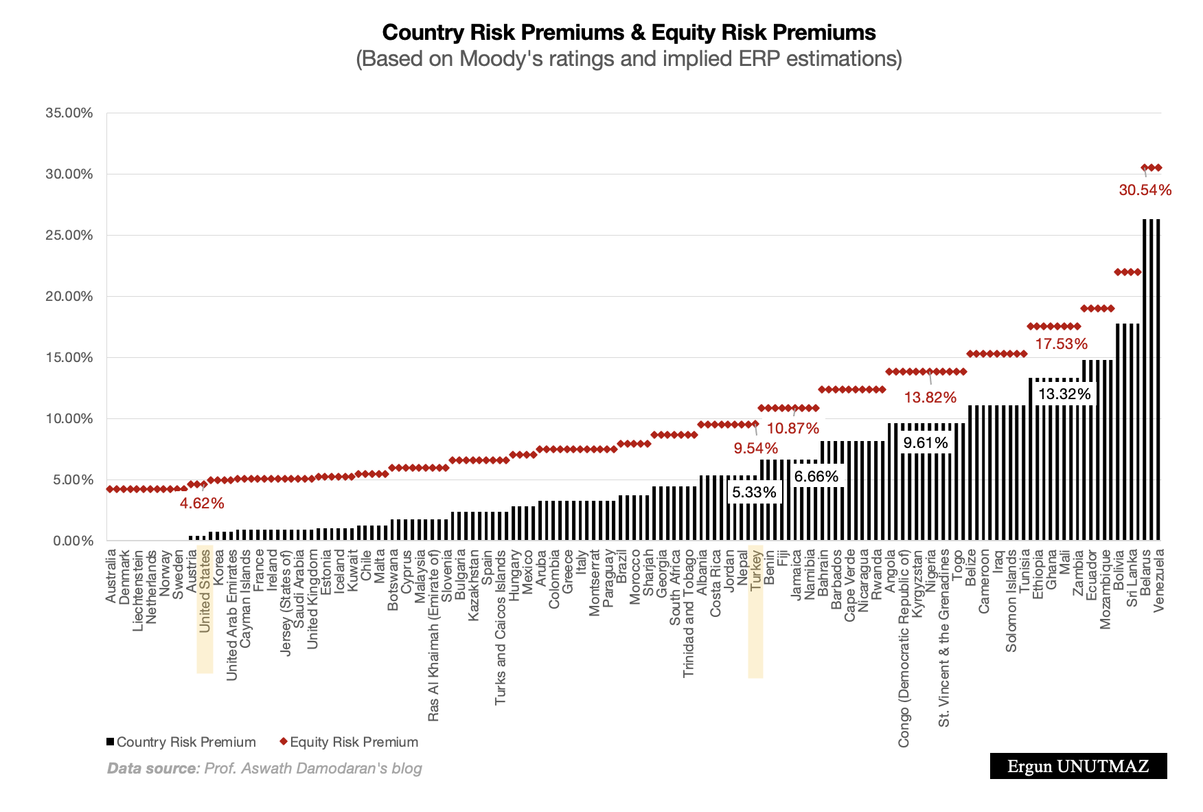 Kavramlar, detaylı açıklamalar ve Brezilya, Türkiye, Almanya, ABD karşılaştırmalarını yaptığım önceki bir çalışmayı da inceleyebilirler. Veri seti için Damodaran Hoca’nın sitesini de ekledim.