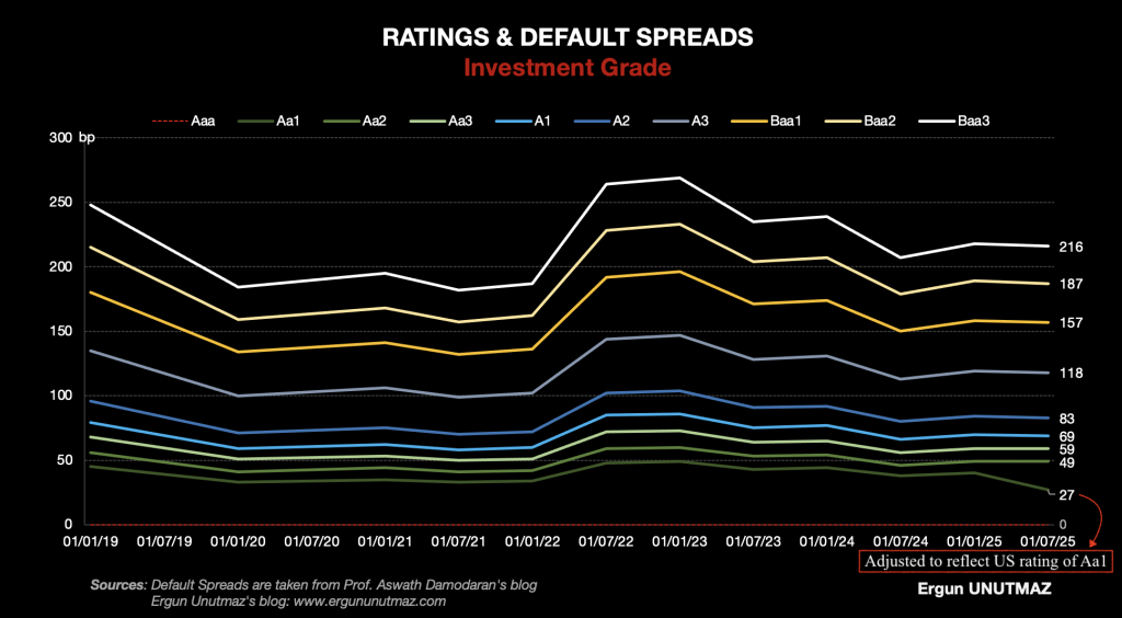 Profesör Aswath Damodaran, Ocak ve Temmuz aylarında olmak üzere risk verilerini yılda iki kere paylaşmaktadır. Küresel ölçekte hisse ve ülke riskleri yanında ülke kredi notları, temerrüt riski farkları ve şirketlerin faiz karşılama oranları gibi veriler biz değerleme yapanlar için son derece önemlidir. Bu bağlamda ben de bu sayfada, uzun bir süredir, kendi notlarım ve düşüncelerimle birlikte, Türkiye, Almanya ve ABD için bu değerleri Türkçe olarak yayınlıyorum. Veri seti kapsamlı olduğu için hazırlaması uzun süren bir yazının arka planında Damodaran Hoca’nın yıl başından beri paylaştığı notları Veri Seti 2025 ve Görünüm başlıklı yazımdan takip edebilirsiniz.