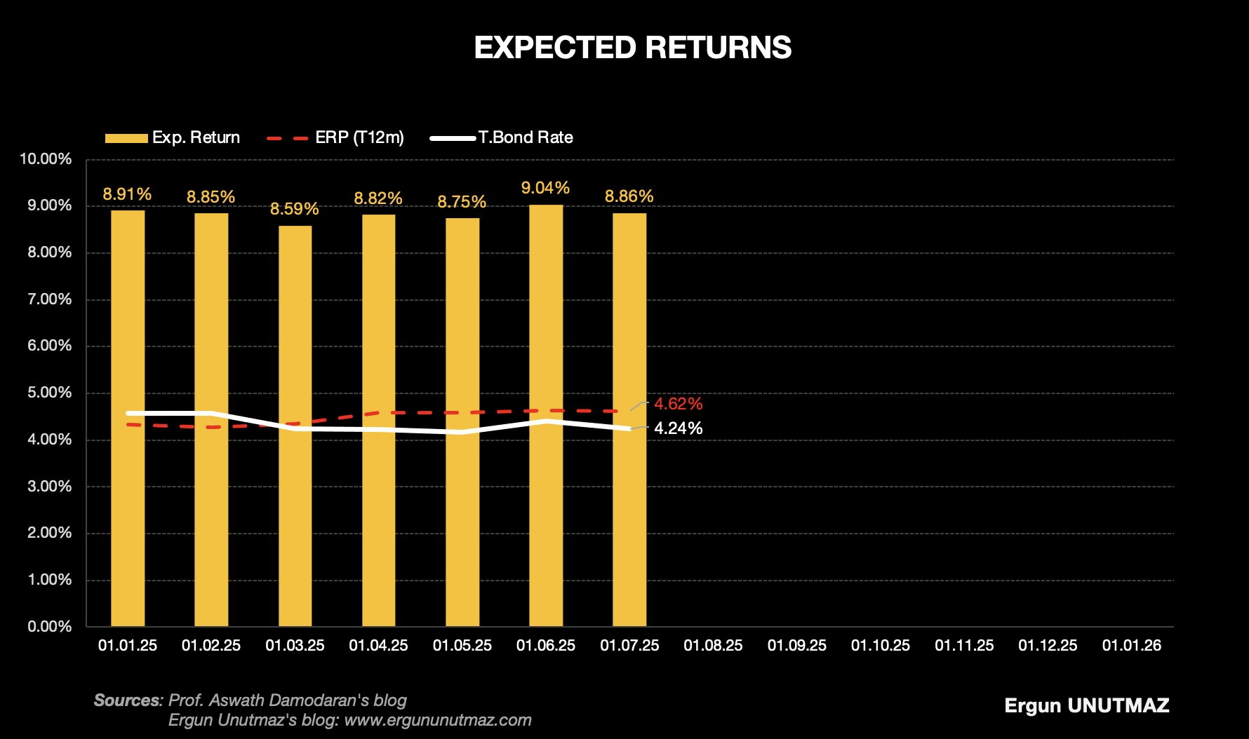 1 Ocak 2025 tarihinde yüzde 4,33 seviyesinde olan hisse senedi risk primi yatay bir seyir sonrasında hafif bir yükselişle 1 Temmuz 2025’te yüzde 4,62 seviyesine gelmiştir. Aynı dönemde devlet tahvili getirileri de yüzde 4,58 seviyesinde başladığı 2025 yılını, 1 Temmuz tarihinde yüzde 4,24 seviyesinde tamamlayarak ılımlı bir düşüş sergilemiştir. Beklenen getiri oranı 1 Temmuz 2025’te yüzde 8,86 seviyesine gerilemiştir. Başka bir deyişle tahvillerdeki getiri düşüşü hisse senedi risk priminde görülen yükselişle dengelenerek beklenen getiri 2025 yılına başladığı noktaya yakın bir yerdedir. S&P 500 Endeksini gösterge piyasa olarak aldığımız için hisse senedi risk primi diğer piyasalar açısından da artış göstermiştir.