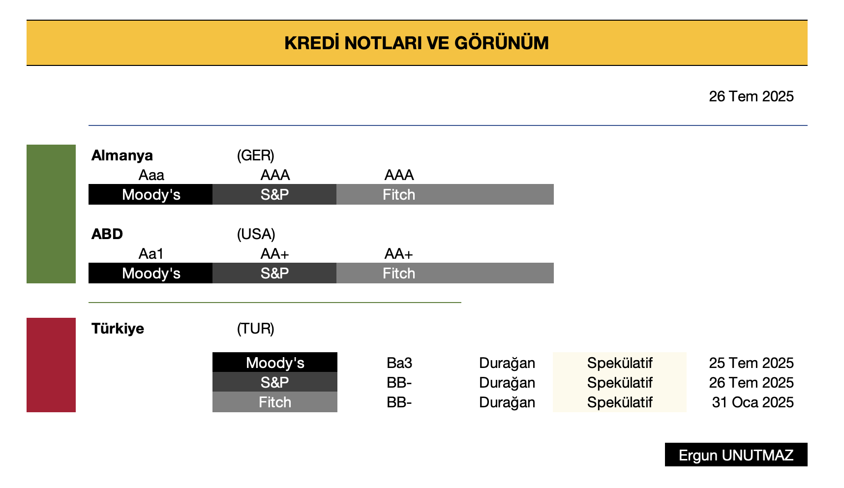 Tablo 2’deyse Türkiye için üç farklı kredi derecelendirme kuruluşunun vermiş olduğu ülke kredi notları son güncellemenin yapıldığı ilgili tarihlerle gösterilmektedir. Tabloda kırmızı renkle vurguladığım Türkiye’nin kredi notu uzun süre sonra tekrar üç derecelendirme kuruluşu tarafından da aynı notun verildiği noktaya işaret etmektedir. 25 Temmuz tarihinde Moody’s, Türkiye’nin kredi notunu bir basamak yükseltirken görünümü durağan olarak belirtmiştir. 26 Temmuz tarihinde Fitch’ten gelen değerlendirme ise önceki not ve görünümün korunması yönünde olmuştur. Sevindirici ve beklenen bu gelişmeye temkinli yaklaşmakta da fayda var. Çünkü mevcut durumda Türkiye’nin kredi notu 22 basamaktan 13. basamakta yer almaktadır ve hâlâ yatırım yapılabilir seviyenin 3 basamak altında bulunmaktadır. Bu konum spekülatif karakter bölümüne denk gelmektedir.