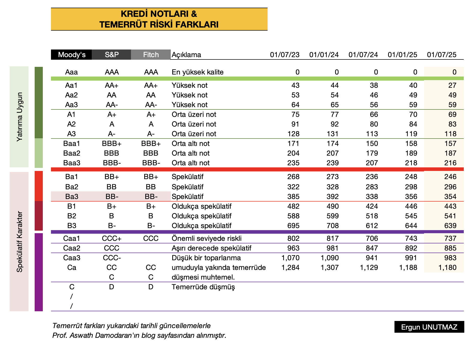Tablonun dikey olarak ikinci yarısıysa Temerrüt Farkı (Ds) için bu notların karşılık geldiği risk düzeylerini belirtmektedir. En sağdaki sütun son yayınlanan verileri içermekte olup 01 Temmuz 2025 tarihini esas almaktadır.