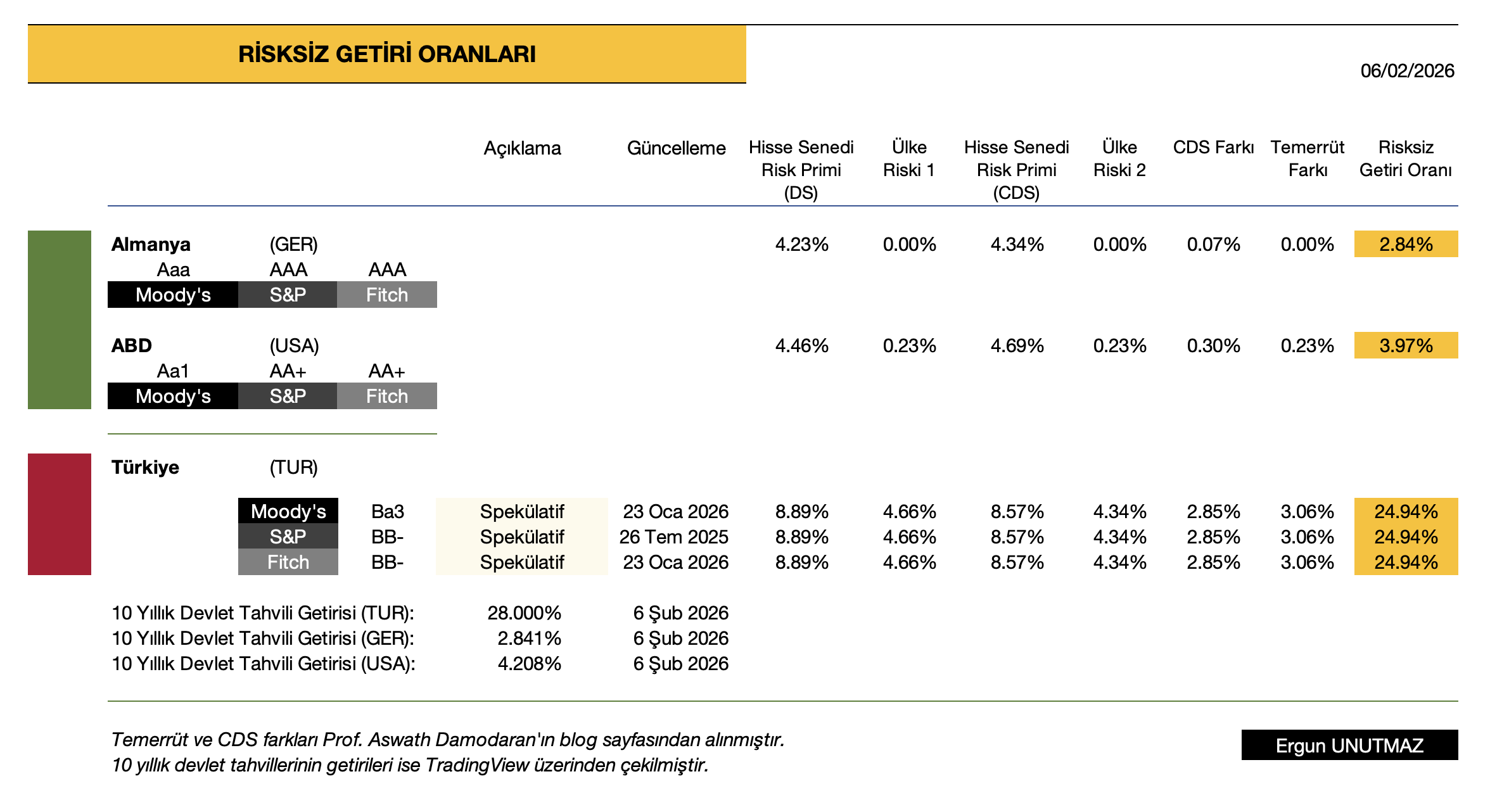 Tablo 3’te, Türkiye, Almanya ve ABD için temerrüt riski farkları ile risksiz getiri oranları yer almaktadır. Almanya Aaa şeklinde en üst düzey kredi notuna sahip ülke konumunu devam ettirirken ABD için kredi notu Aa1 şeklindedir. Almanya için 10 yıllık tahvillerin getirileri doğrudan risksiz getiri oranı olarak alınabilmektedir. 06 Şubat 2026 tarihli kapanışta bu oran yüzde 2,841 şeklidedir. Dolayısıyla bu oran Avrupa’daki şirketlerle yürütülecek İndirgenmiş Nakit Akışları Değerlemesinde risksiz getiri oranı olarak kullanılabilir. ABD içinse kredi notu ve temerrüt farkı dikkate alınmalıdır. 10 yıllık devlet tahvili getirisi yüzde 4,208 seviyesindedir. Türkiye içinse oran son kapanışta yüzde 28,00 olarak geçmektedir. Mevcut tahvil getirisinin gerçekleri yansıtmayabileceğini düşünenler daha önce paylaşmış olduğum simülasyon yöntemini kullanabilirler.