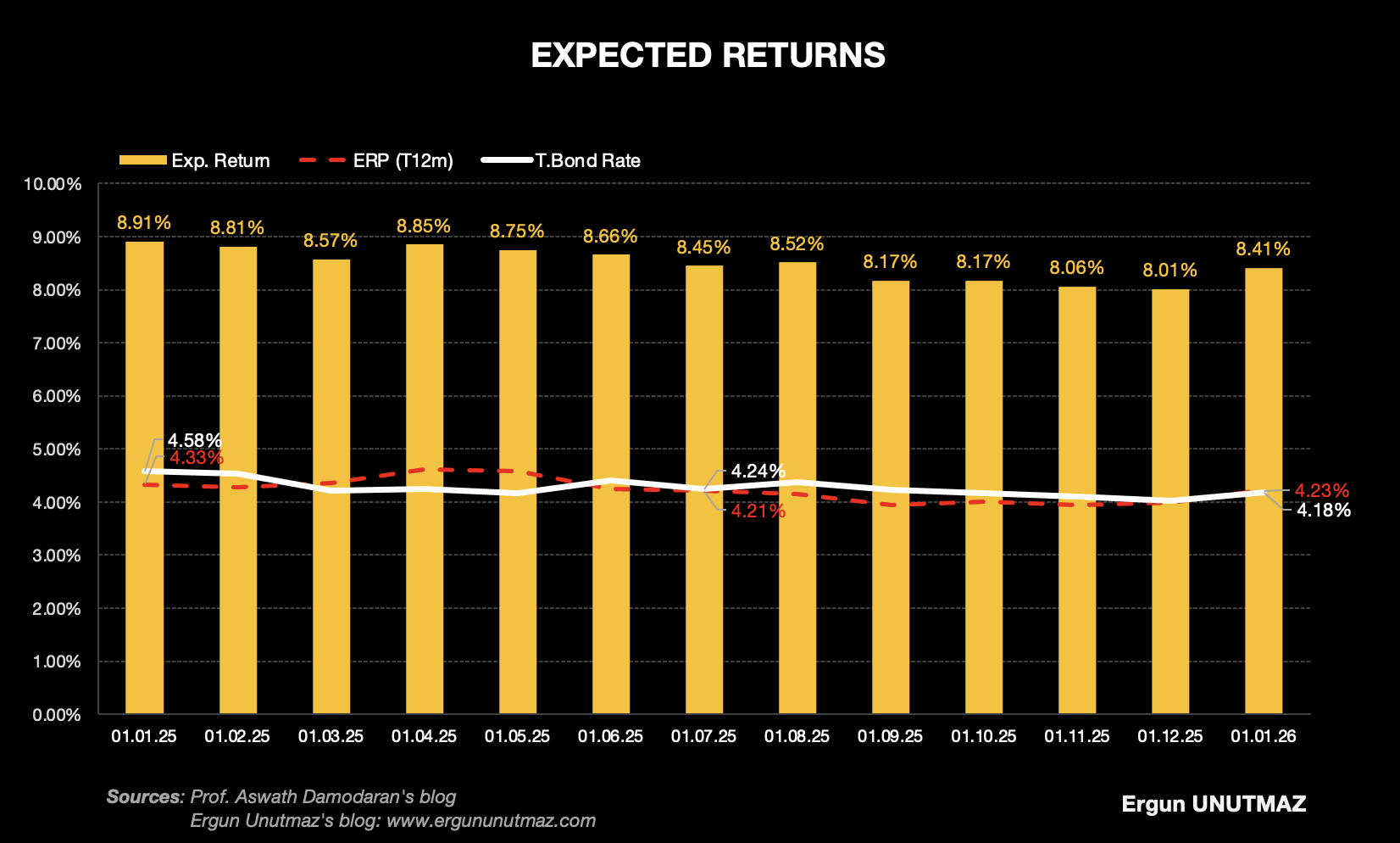 Damodaran Hoca’nın S&P 500 Endeksinin aylık kapanış verilerini baz alarak her ay paylaştığı hisse senedi risk primi çıktısı yanında bir de altı ayda bir güncellediği çalışması vardır. Aradaki geçişi takip edebilme kolaylığı açısından hisse senedi risk primi (kırmızı), on yıllık devlet tahvili getirisi (beyaz) ve bunların toplamından oluşan beklenen getiri değerlerini (sarı) 2025 yılının başından 2026 yılı Ocak ayına kadar Grafik 2’de gösterdim.