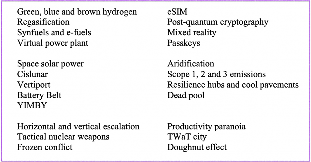 Daha önceki bölümde Covid-19 sonrası nasıl herkesin bir gecede tıp, aşı ve biyoteknoloji konusunda uzman olduğunu; Ukrayna’nın işgali ile askeri, strateji ve savunma sistemleri alanında yeni kelimeler kullandığımızı belirtmiştim. Bu yıl The Economist dergisi bir kolaylık yaparak 2023 yılında bolca duyabileceğimiz 23 kelimeden oluşan mini bir sözlük hazırlamış. Her birinin tarifine burada yer vermek mümkün değil, ancak listeyi sizlerle de paylaşayım.