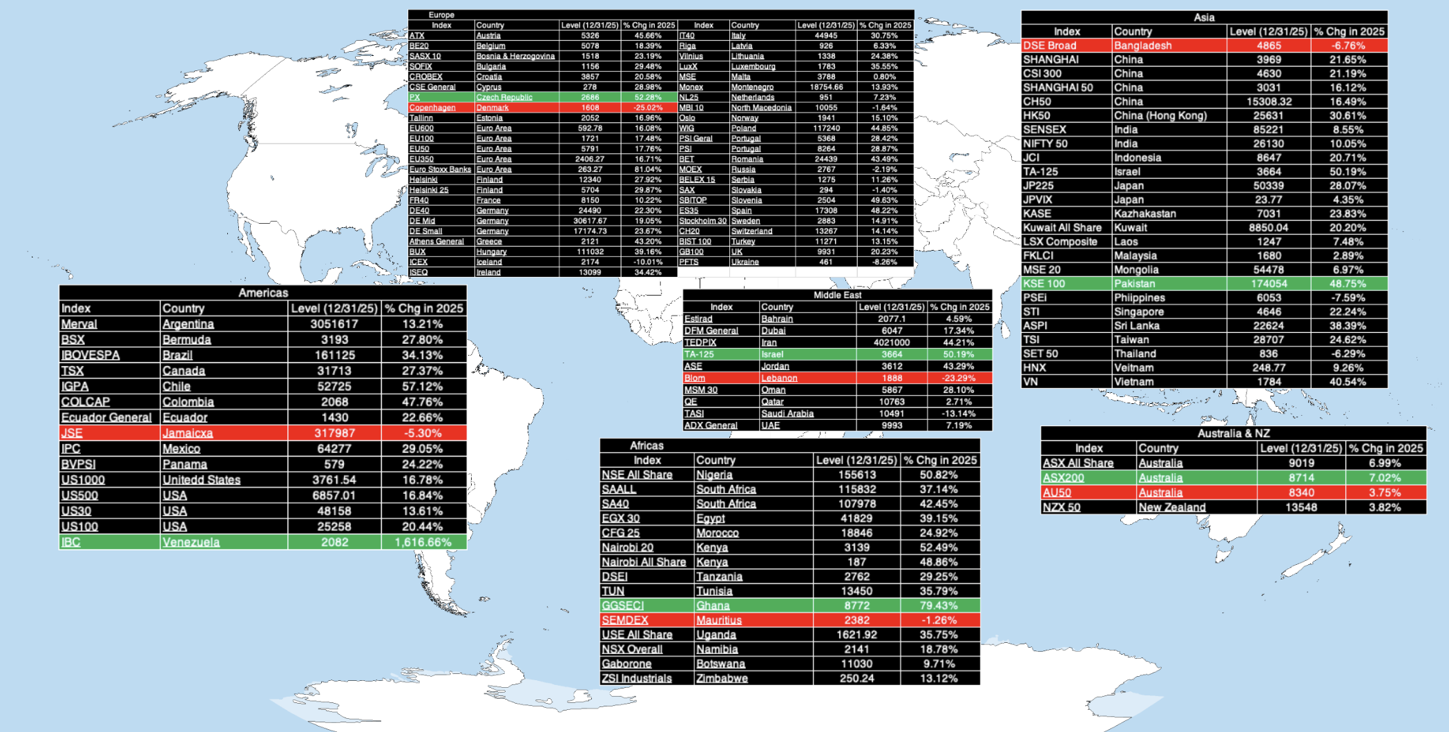 Altı bölge için ilgili borsa endekslerinin, kendi para birimleri üzerinden getirilerin yukarıdaki tabloda sunan Damodaran Hoca; en iyi performansı yeşil, en kötü getiriyi ise kırmızı renkle işaretlemiştir. Mesela Avrupa’da en yüksek getiri %52,28 ile Çekya’ya aitken en kötü performans yüzde 25,02 düşüşle Danimarka’ya aittir. Türkiye için Türk lirası bazında getiri 2025 yılı için %13,15 olarak gösterilmiştir.