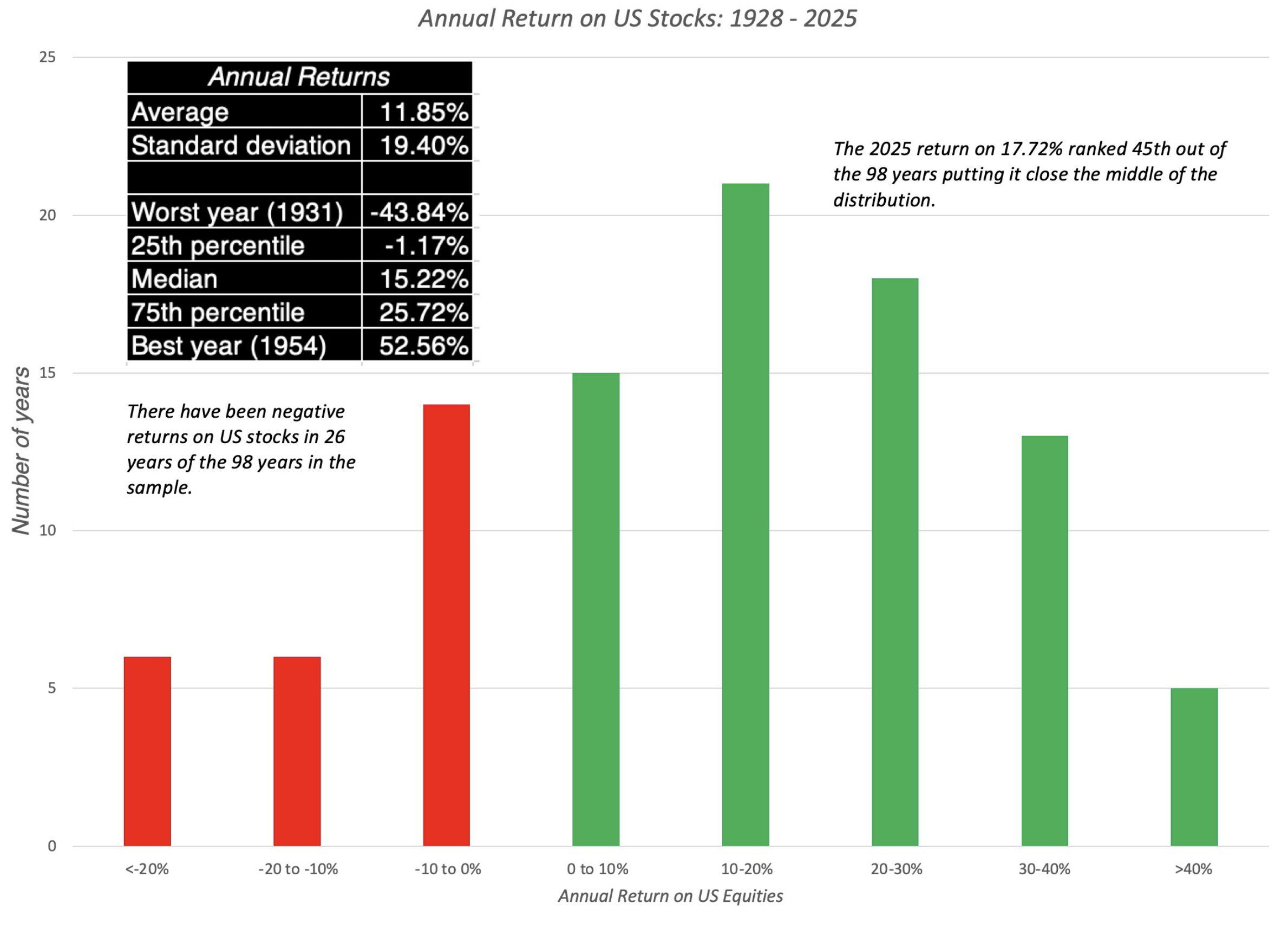 Görsel 3’te yıllara göre paylaştığım getiri oranlarına ek olarak Damodaran Hoca, söz konusu bu getiri oranını geçen 98 yılın getiri oranlarıyla karşılaştıran bir histogram da sunmaktadır. Bunu da Görsel 4’e ekledim. ABD hisseleri için 1928-2025 yılları arasında ortalama getiri yüzde 11,85 ve ortanca değer yüzde 15,22’dir. Dolayısıyla 2025 yılı, ortanca değerin biraz üzerinde, 98 veri arasında 45. sırada yer almaktadır. Önemli detaysa üst üste ortanca değerin aşıldığı üçüncü yılı yaşadık ve bu, 1990 sonrası en uzun seridir. Yani temkinli olup piyasa dışında kalmayı tercih edenler muazzam bir kazanç fırsatını kaçırdılar.