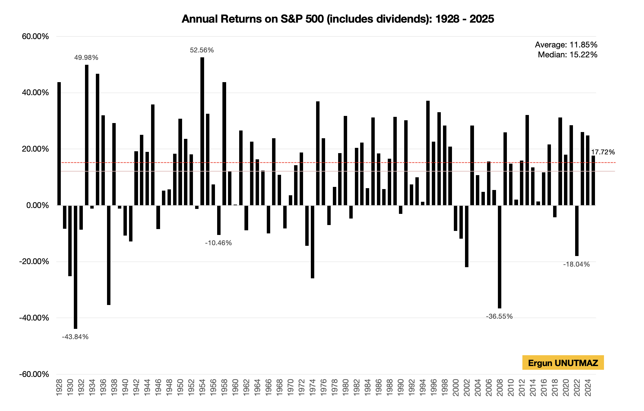 Görsel 3’te yıllara göre paylaştığım getiri oranlarına ek olarak Damodaran Hoca, söz konusu bu getiri oranını geçen 98 yılın getiri oranlarıyla karşılaştıran bir histogram da sunmaktadır. Bunu da Görsel 4’e ekledim. ABD hisseleri için 1928-2025 yılları arasında ortalama getiri yüzde 11,85 ve ortanca değer yüzde 15,22’dir. Dolayısıyla 2025 yılı, ortanca değerin biraz üzerinde, 98 veri arasında 45. sırada yer almaktadır. Önemli detaysa üst üste ortanca değerin aşıldığı üçüncü yılı yaşadık ve bu, 1990 sonrası en uzun seridir. Yani temkinli olup piyasa dışında kalmayı tercih edenler muazzam bir kazanç fırsatını kaçırdılar.
